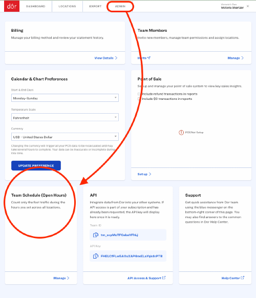 By setting your store’s operating hours in the Dor dashboard, traffic that occurs outside of open hours, such as staff arriving early, cleaning crews, or delivery personnel, can be excluded from customer counts.